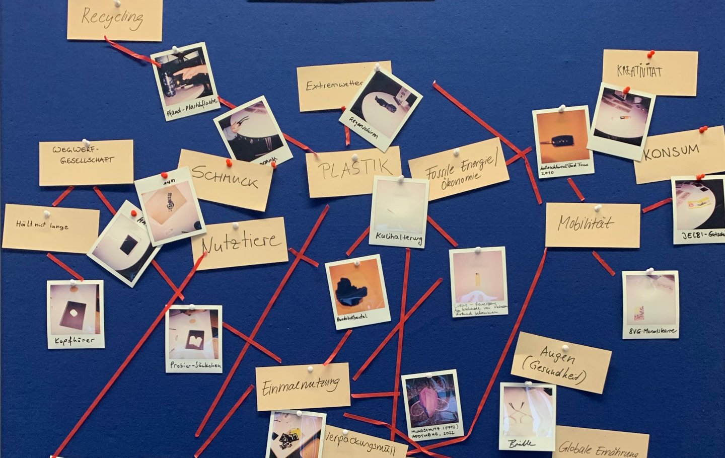 Mit einer Polaroid-Kamera ausgerüstet haben wir Besucher:innen gebeten, einen Blick in ihre eigene Tasche zu werfen und dort nach einem Objekt zu suchen, das in ihren Augen etwas über Umweltveränderungen erzählt. Und siehe da, anhand von persönlichen Dingen oder Alltagsgegenständen ließen sich zahlreiche Geschichten über die Veränderung der Natur aus ganz unterschiedlichen Perspektiven erzählen. Für die daraus entstandene Taschensammlung des Anthropozäns stellten Besucher:innen Verbindungen her zwischen Taschentüchern, Feuerzeugen oder Smartphones und globalen Umweltthemen.